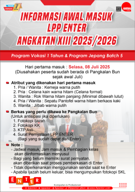 INFORMASI AWAL MASUK ANGKATAN XIII LPP ENTER 2025/2026 Posted on 2 Juli 2025 by LPP ENTER BORNEO 0 ? PENGUMUMAN Mohon dicermati dengan baik Hari yang ditunggu-tunggu akhirnya tiba! ? Awal Masuk LPP ENTER akan dimulai pada: ? Selasa, 08 Juli 20Continue Reading